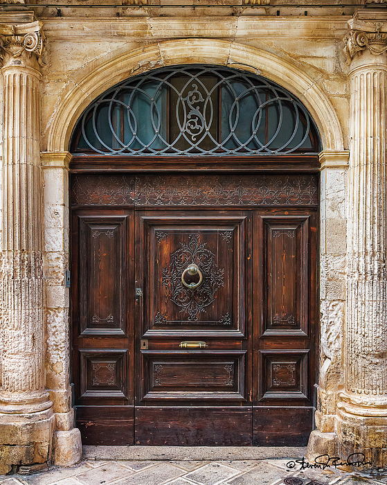 This beautifully preserved wooden door, adorned with intricate carvings, stands as a testament to the architectural style of Martina Franca in Puglia, Italy. The door features ornate detailing and a decorative knocker at its center. Surrounding the entrance are grand columns, enhancing the historical significance of the structure. The elegant archway above, complemented by delicate wrought ironwork, frames the door perfectly.