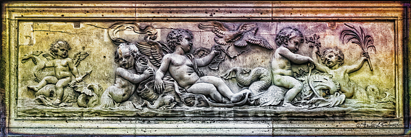 A weathered stone relief sculpture depicts four cherubs, each with different activities, including riding a seahorse, playing with a bird, and holding a branch. The cherubs are sculpted in a classic style, and the detail of their features is remarkable.