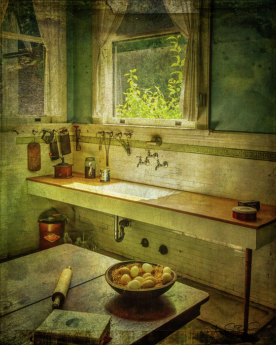 A vintage kitchen with a white sink, a wooden countertop, and a window overlooking a garden. A bowl of eggs sits on a wooden table next to a rolling pin and a book, suggesting the preparation of a meal. The room is bathed in soft, warm light, adding to the nostalgic atmosphere.