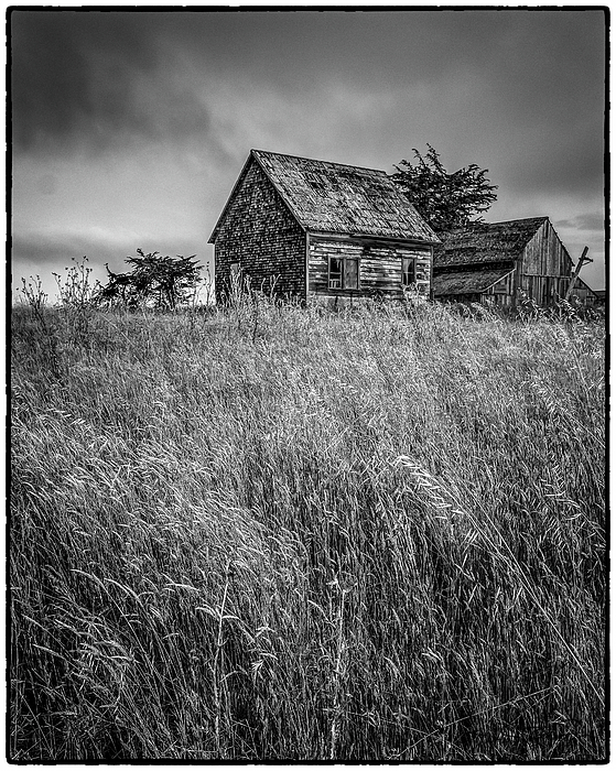 Black And White Photograph of Two Abandoned Farmhouses in Tall Grass, Mendocino, California