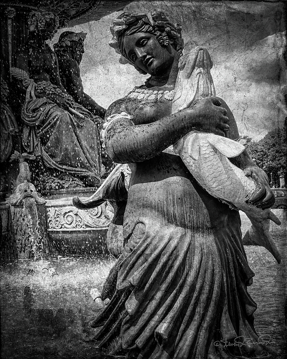 A black and white photograph of a fountain statue in Paris, France. The statue depicts a woman holding a fish, and the water of the fountain flows around the statue's feet.