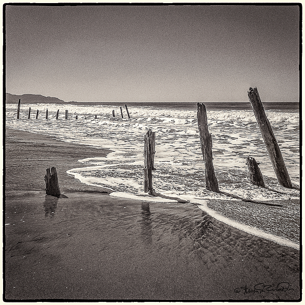 Wooden Pilings Standing On The Beach In Black And White, Fort Funston, San Francisco